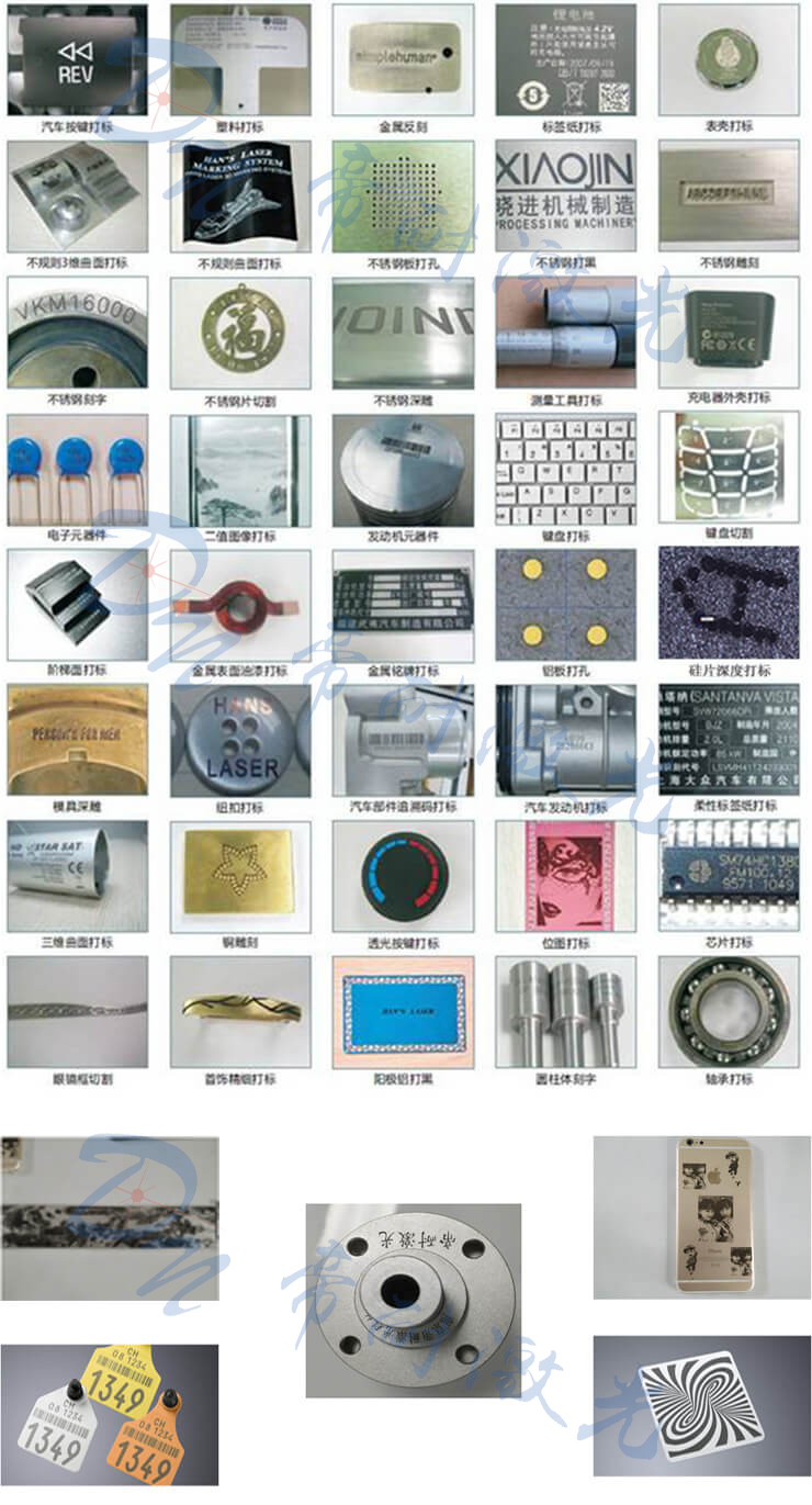 廣泛適用于集成電路芯片、電腦配件、工業(yè)軸承、鐘表、電子及通訊產(chǎn)品、航天航空器件、各種汽車零部件、家電、五金工具、模具、電線電纜、食品包裝、首飾、煙草以及軍工產(chǎn)品等眾多領域圖形和文字的標記,以及大批量生產(chǎn)線作業(yè)。